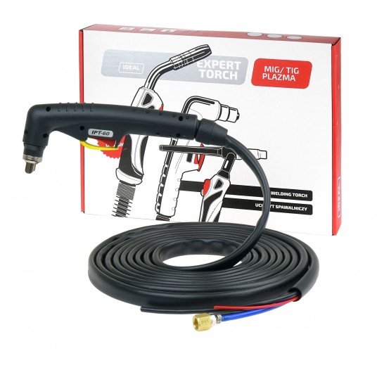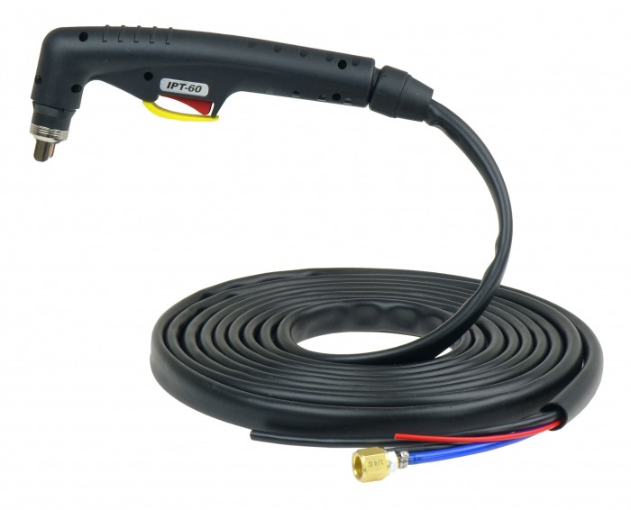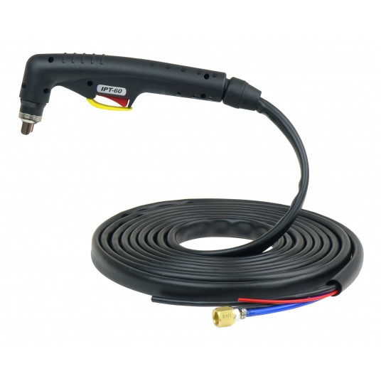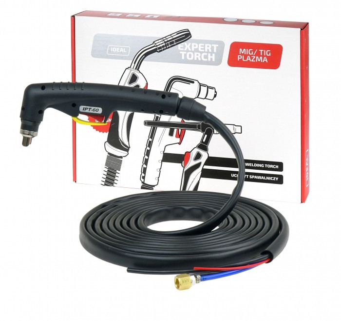 Uchwyt zakończony przewodem prądowym, przewodem gazowym ze złączem 1/4G, przewodem łuku pilotującego, 2 przewodami sterującymi oraz 2 przewodami zabezpieczenia dyszy zewnętrznej.